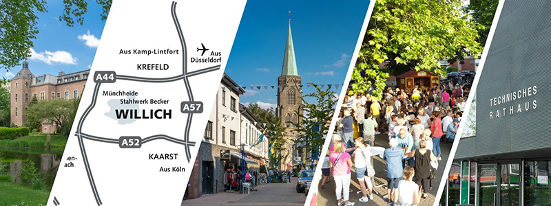 Die Stadt Willich liegt mit ihren gut 50.000 Einwohnern am östlichen Rand des Kreises Viersen, nah zu Düsseldorf, Krefeld und Mönchengladbach. Eine liebens- und lebenswerte Stadt, die 1970 aus den vier selbstständigen Gemeinden Willich, Anrath, Schiefbahn und Neersen entstand.